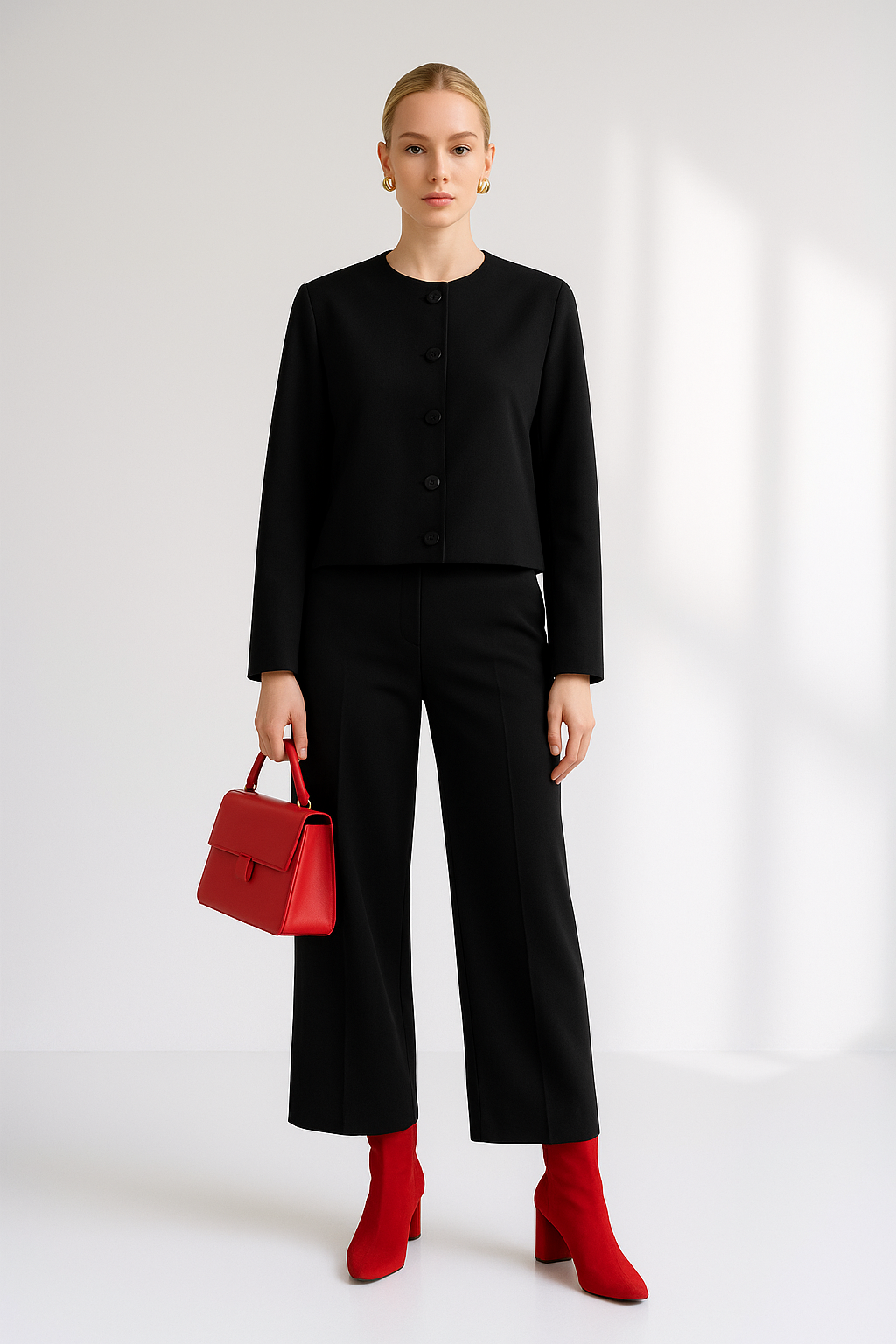 Elevate your style with this elegant women’s blazer, crafted from premium fabric for a refined look. Available in striking red and timeless black, its minimalist design and long sleeves create a sleek silhouette. The clean button-front closure adds subtle sophistication, making it an ideal choice for formal events, office settings, or evening occasions. This blazer seamlessly combines classic elegance with modern flair.