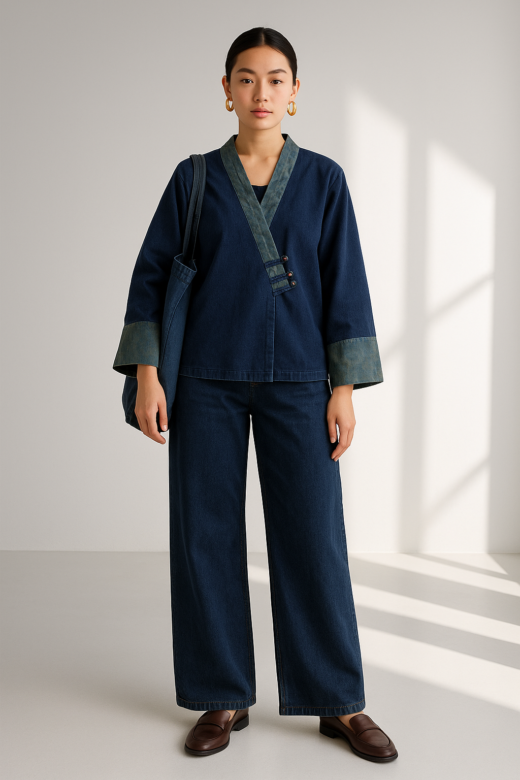 Step into the season with this autumn-new women's jacket, featuring a striking contrast-color V-neck and wide cuffs that elevate its unique kimono style. The soft, long-sleeve fabric has a subtle jacquard denim effect finish, offering a contemporary texture without the stiffness of traditional denim. Its sophisticated double-placket design makes it a versatile, comfortable, and eye-catching layer for transitional weather.