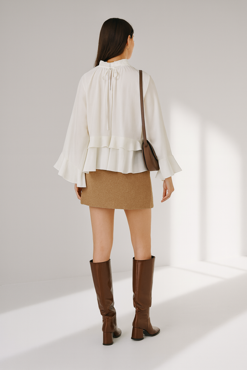 This stylish women's blouse features an elegant stacked high neck design with a chic bow-tie detail for a sophisticated look. The loose-fit silhouette and long sleeves with delicate ruffle cuffs provide beautiful drape and movement. Crafted in crisp white, this fashionable blouse is the perfect top for transitioning into warmer weather.